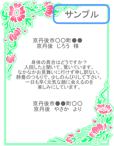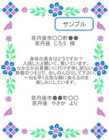 | 京丹後市弥栄町●● 京丹後 ○○ 様 身体の具合はどうですか? 入院したと聞いて、驚いています。 なかなかお見舞いに行けず申し訳ない。 静養のつもりで、少しのんびりして下さい。 一日も早く元気な顔に会えるのを楽しみにしています。