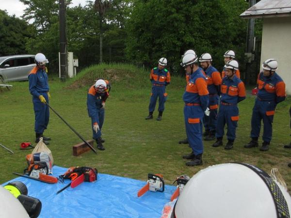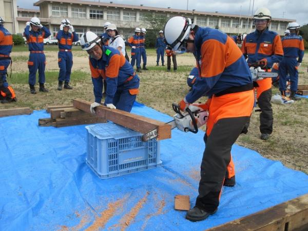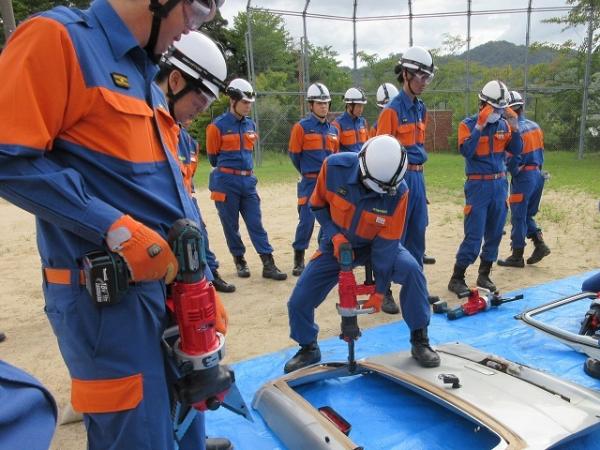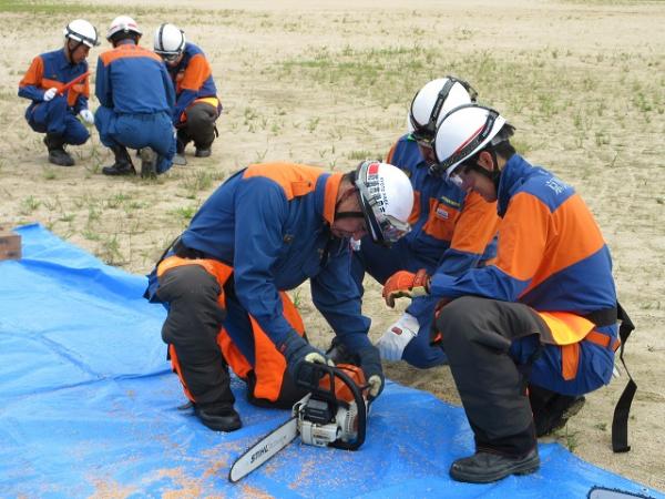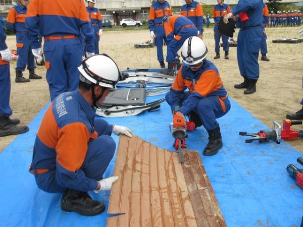 訓練では、消防署員の指導のもと、「チェーンソーの操作」「電動コンビツールによる切断作業」「バールなど使った基本的な救助法」など実践的な内容を、実際に手を動かしながら確認しました。