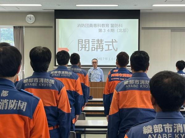 10月25日(土曜日)、京都府立消防学校北部訓練拠点で開催された「消防団員専科教育 警防科(第34期・北部)」に、京丹後市消防団から指導員14名が参加しました。
