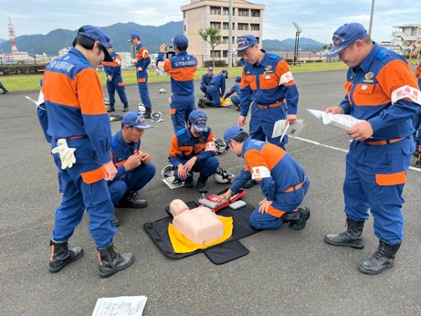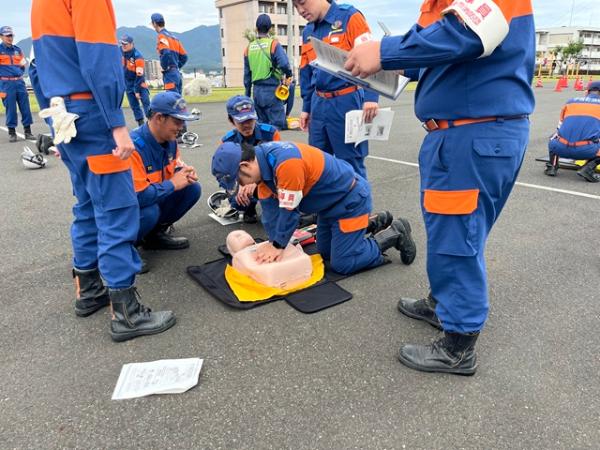 午後からは、心肺蘇生法やAEDを用いた救急訓練、小型ポンプを使用した放水訓練などの実技を実施し、実践的な技術の習得に取り組みました。