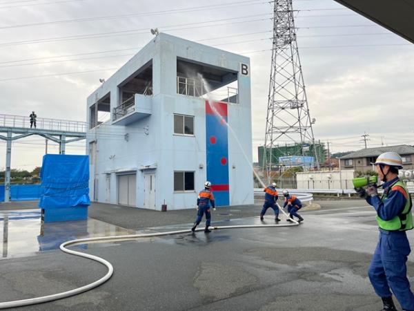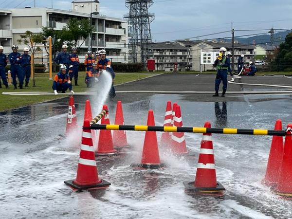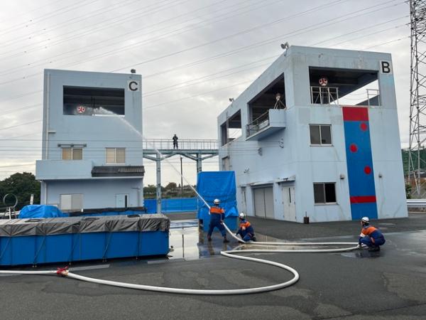 今回の訓練では、消火器や消火栓の取り扱いについて訓練を行い、実際にホースを展張し、放水を行うことができました。