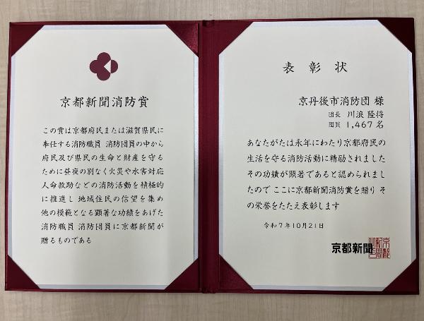 「京都新聞消防賞」は、消防や防災、人命救助などの分野で顕著な功績を挙げた個人や団体に贈られる栄誉ある賞です。京丹後市消防団は、日頃の災害活動や防火・防災に関する取組が高く評価され、今年度の受賞となりました。