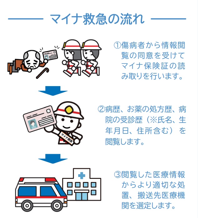 救急搬送時に、しんどくて話せない場合やかかりつけの病院、飲んでいるお薬が分からない場合にマイナ保険証を読み取ることで医療情報を閲覧し、負担軽減や円滑な搬送先の選定と適切な応急処置が期待できます。