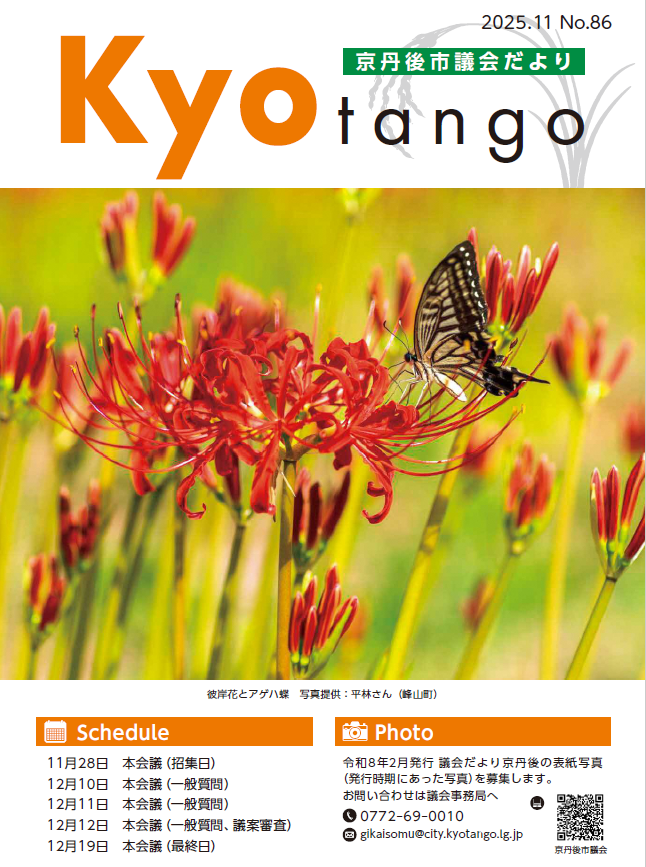 ◎京丹後市議会では、議会だより(5月・8月・11月・2月発行)の表紙写真を募集しております。それぞれの発行時期にあった、市内の魅力ある写真をぜひ応募ください。