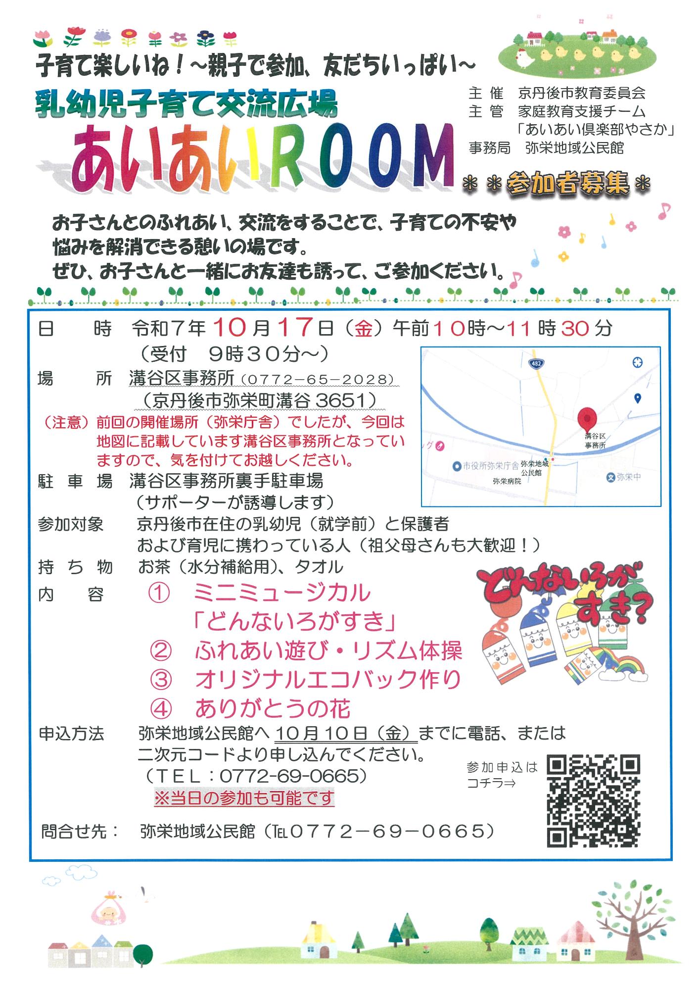 子育て中のおとうさんおかあさん同士の交流の場として、また悩みを相談したり思いを共有したりできるような仲間づくりの場となることを目的に、あいあいROOMを開催します。