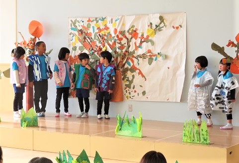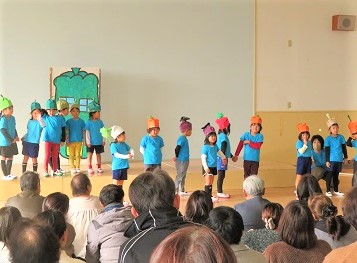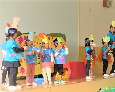 4歳児は言葉や想像力が著しく発達してきました。また集団の中の自分を意識するようになり、協力し合ったり相手に合わせたりする力がついてきています。発表会では友達の表現する姿を認めながら、自分らしさがキラッと光るステージを見せてくれました。やり切った達成感はきっと自信にもつながっています。