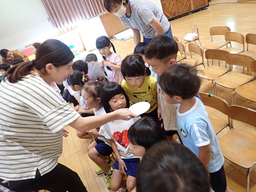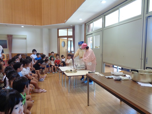 8月の誕生会は、網野中学生の吹奏楽の皆さんが来て下さり、楽器の紹介や演奏を披露して下さいました。子どもたちは音楽に合わせて歌ったり手拍子をしたりして盛り上がりました。生の演奏を五感で感じる貴重な体験をさせていただきました。