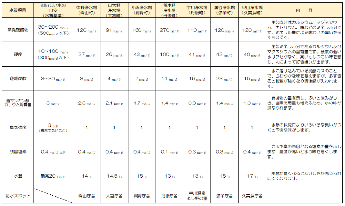 厚生省(現厚生労働省)が設置した「おいしい水研究会」から、「おいしい水」の目安となる要件7項目が報告されています。