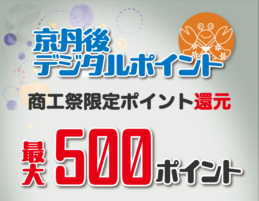 10月26日(日曜日)に丹後王国「食のみやこ」で開催される京丹後商工祭で、会場内の京丹後デジタルポイントブースにて現金チャージをしていただくと、チャージ金額の10%のポイントが還元されます!