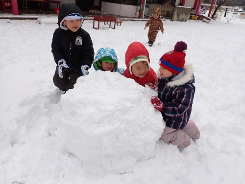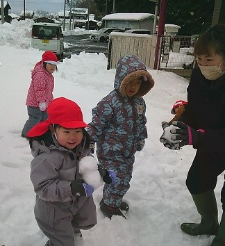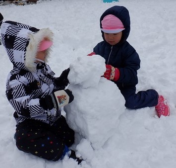 異年齢の友達と一緒に力を合わせて、雪だるまづくりを楽しみました。