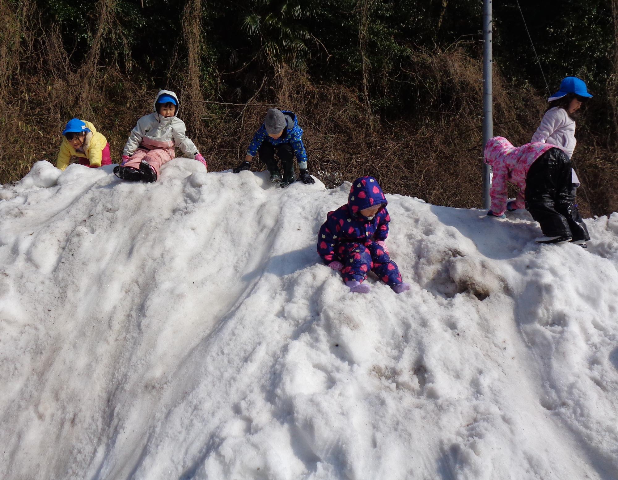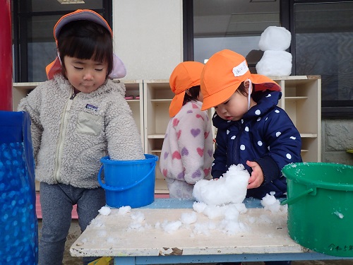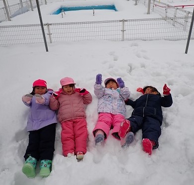 今年は、一度にたくさんの雪が降り、園庭が、一面真っ白になりました。子どもたちは大喜びで、それぞれの年齢に応じた遊びを通して雪に触れ五感を働かせながら冬の自然を感じました。