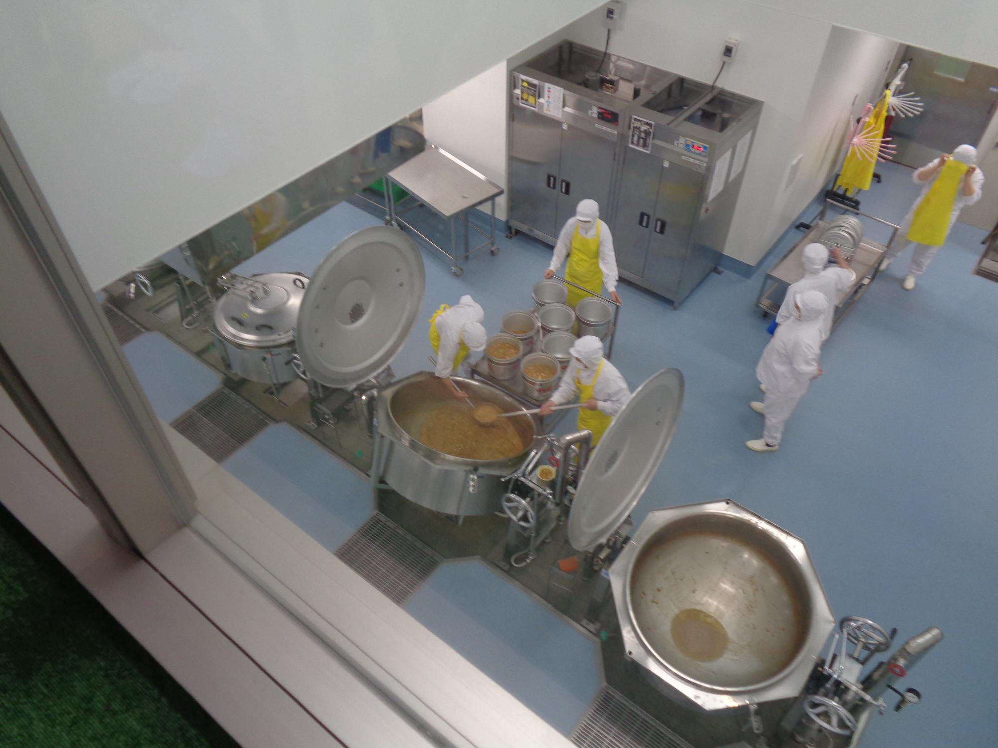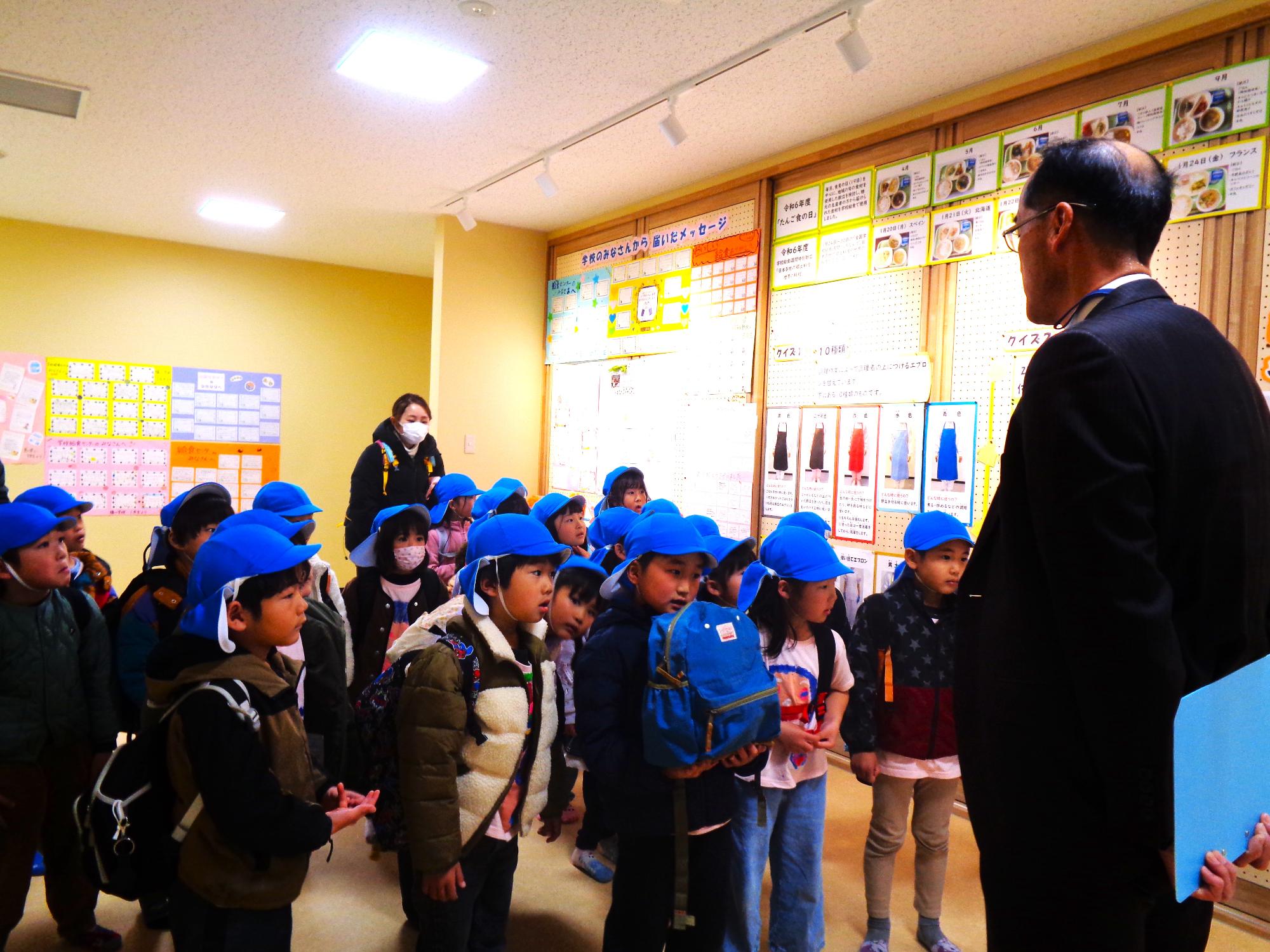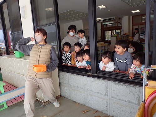 丹後大国では、動物とのふれあいを楽しんだり、公園で思い切り体を動かしたりしながら、伸び伸びと過ごしました。また、普段は自園で調理された給食を食べていますが、給食センターの見学では、大きな鍋でつくられたお汁を配膳する様子を興味をもって見ていました。800人分をつくると知り、驚いていました。4月からこの給食センターの給食をいただくことを伝えると「楽しみ!」と嬉しそうな表情を見せていました。