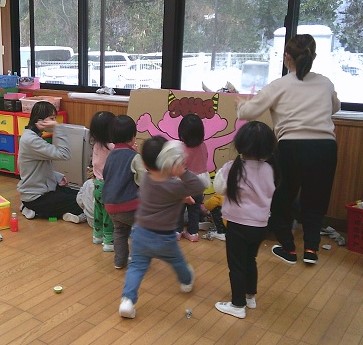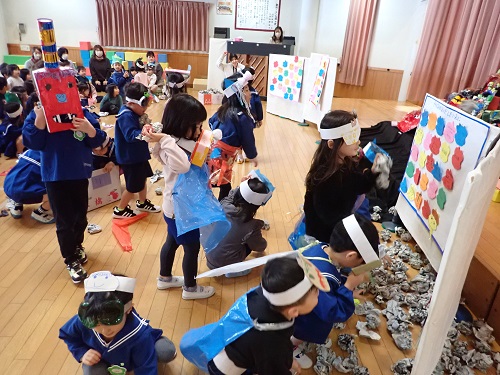 一足早い節分集会を行いました。0.1歳児は保育室で、2.3.4.5歳児は、遊戯室で参加しました。節分の由来の話を聞いた後、ご家庭で書いていただいた「追い出したい鬼」に向かって、新聞でつくった豆を投げたり、テラスでは本物の豆をまいたりしながら「鬼はそと!福はうち!」と園内に元気いっぱいの声を響かせていました。