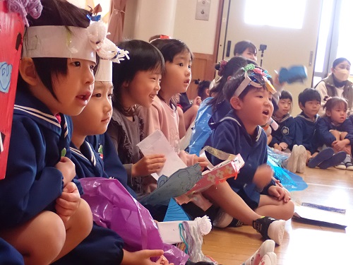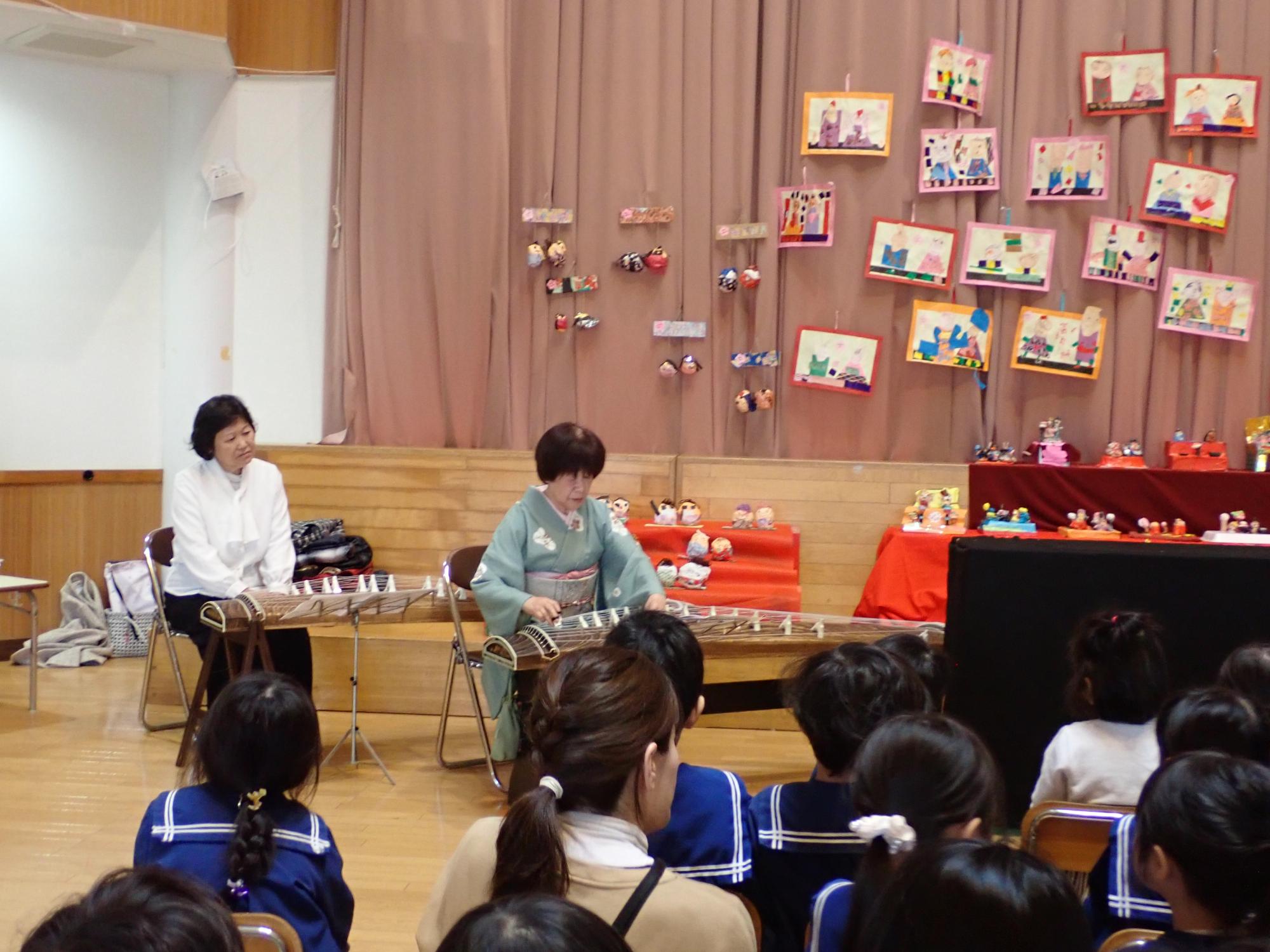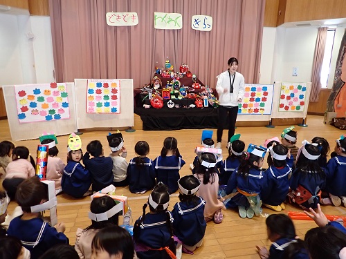 ひな祭り誕生会のお楽しみ会に「琴と語りのデュオひだまりさん」に来ていただきました。絵本の読み聞かせや琴の演奏を披露していただき、子どもたちは美しい音色や物語の世界に引き込まれ、心豊かなひとときを過ごしました
