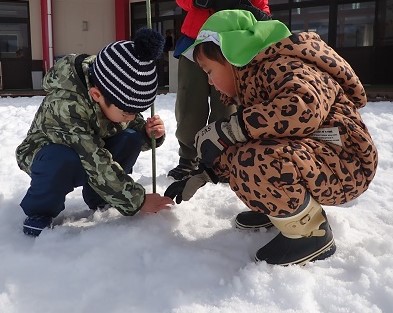 「どれだけ積もったか調べてみよう」と園芸用の支柱を使って雪の深さを確かめていました。