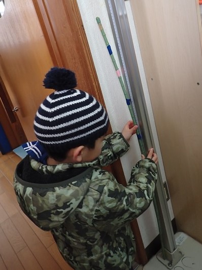 「何センチかな?」と身長計を使って雪の深さを測り「ここまであるわ」と伝え合っていました。