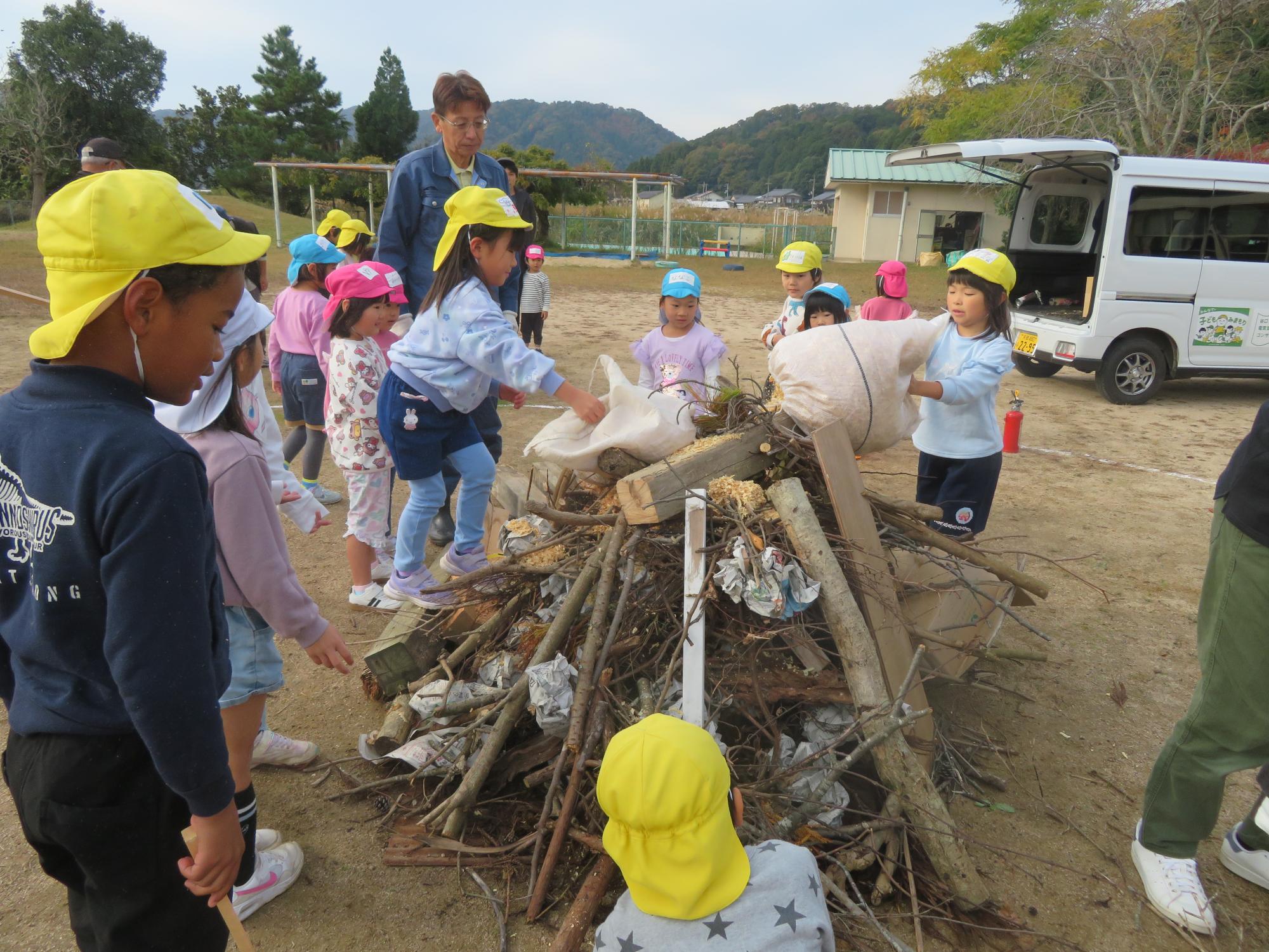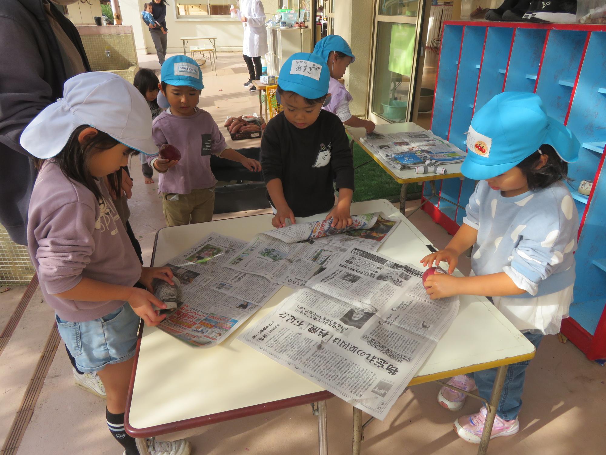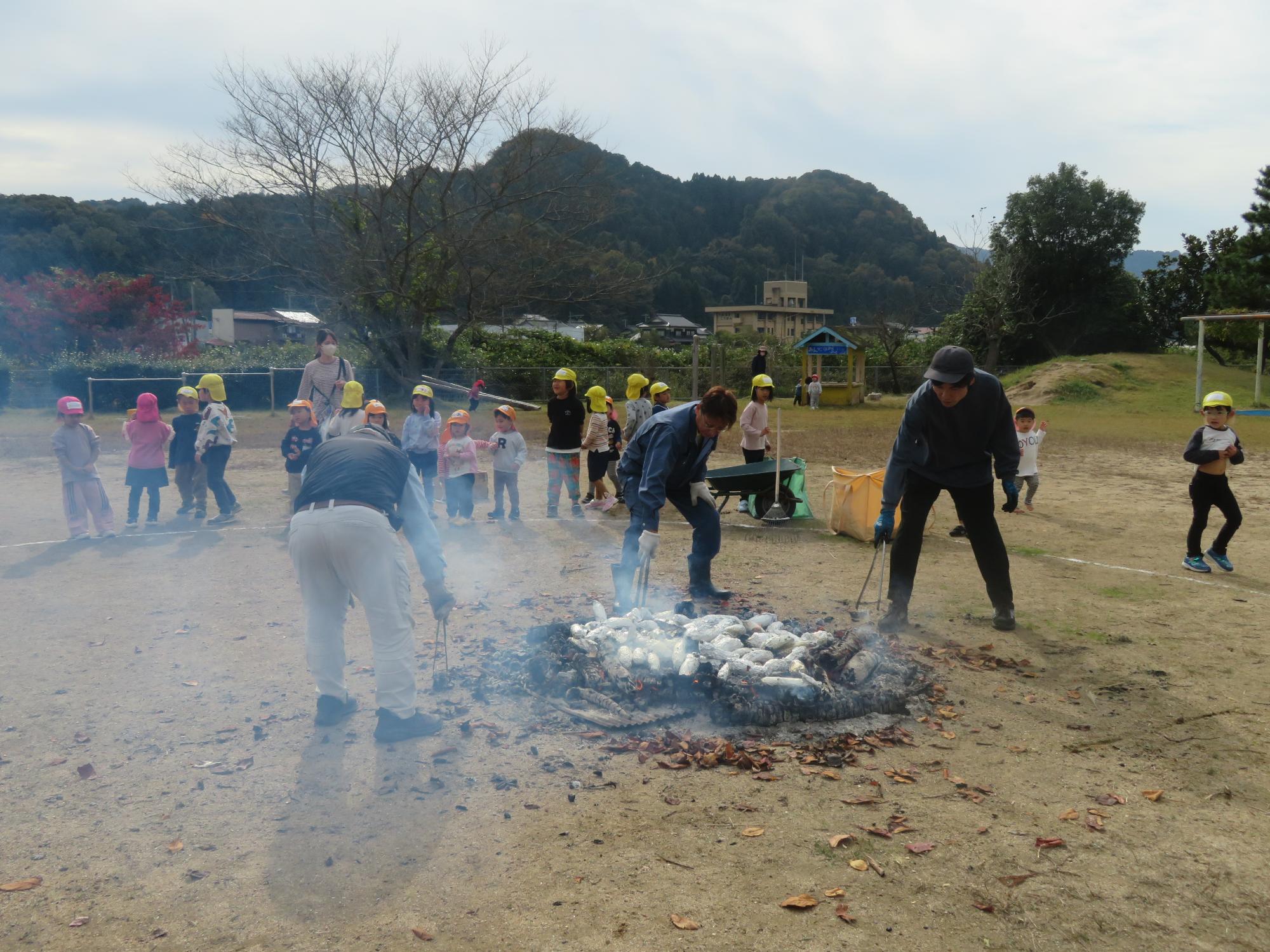 収穫したさつまいもを使って“焼き芋大会です。”落ち葉や枯れ枝も自分たちで集めました。芋の包み方は大きい子が小さい子に教えてあげ、火の番は地域の応援団の方にお手伝いいただき、ホクホクの焼き芋ができました。人とのつながりや焚火の匂いや温かさ、パチパチ焼ける様子など、五感が刺激される貴重な体験となりました。