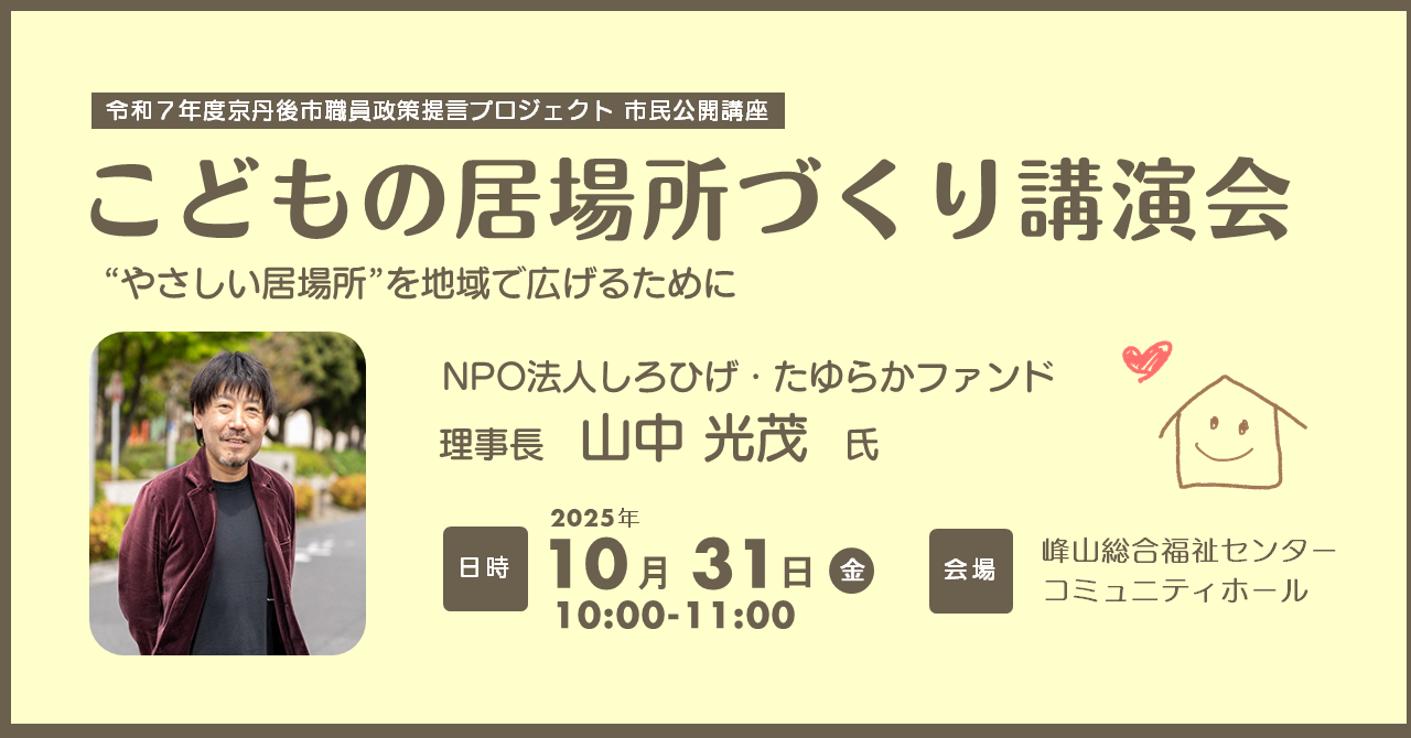 今回の講演会では、不登校、こころの障がい、ひきこもり、孤独など、生きづらさを抱えながら日々を過ごしている人たちのために「それぞれの居場所」をつくる活動を行うNPO法人しろひげ・たゆらかファンド理事長の山中光茂氏を講師にお招きし、居場所づくりの実践事例や居場所づくりの意義について、元松坂市長、現役医師という様々な経験をもとにお話しいただきます。