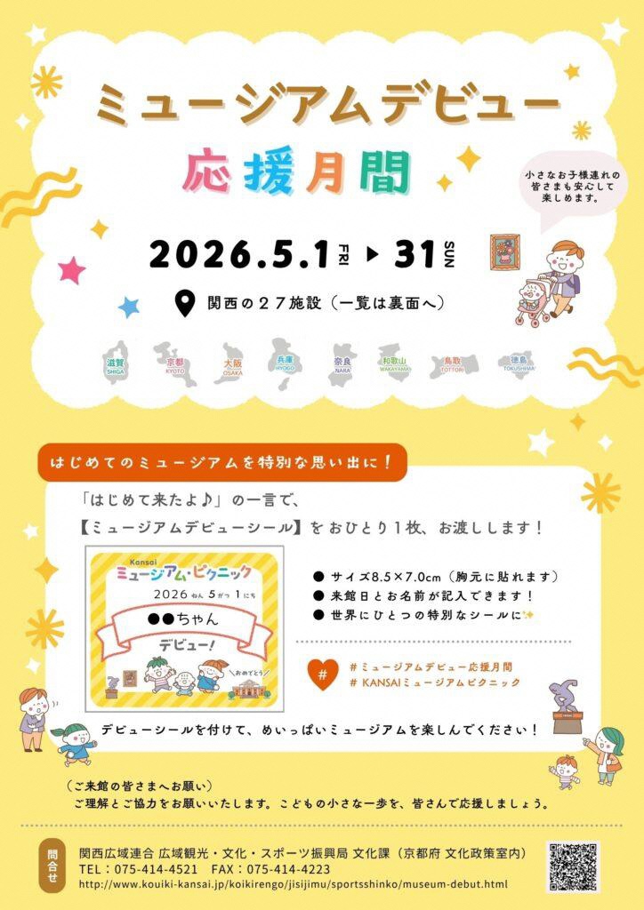 ミュージアムデビューをしてみませんか Tweet 5月は「ミュージアムデビュー月間」 期間中、関西の博物館や美術館などをはじめて訪れるお子さんに来館記念となる「ミュージアムデビューシール」をお渡しします。 世界に一つだけのシールと一緒に、ミュージアムデビューを特別な思い出に残してみませんか? 詳しくはこちら →対象施設など お問い合わせ:関西広域連合 広域観光・文化・スポーツ振興局文化課 電話:075-414-5166 更新日:2026年04月21日