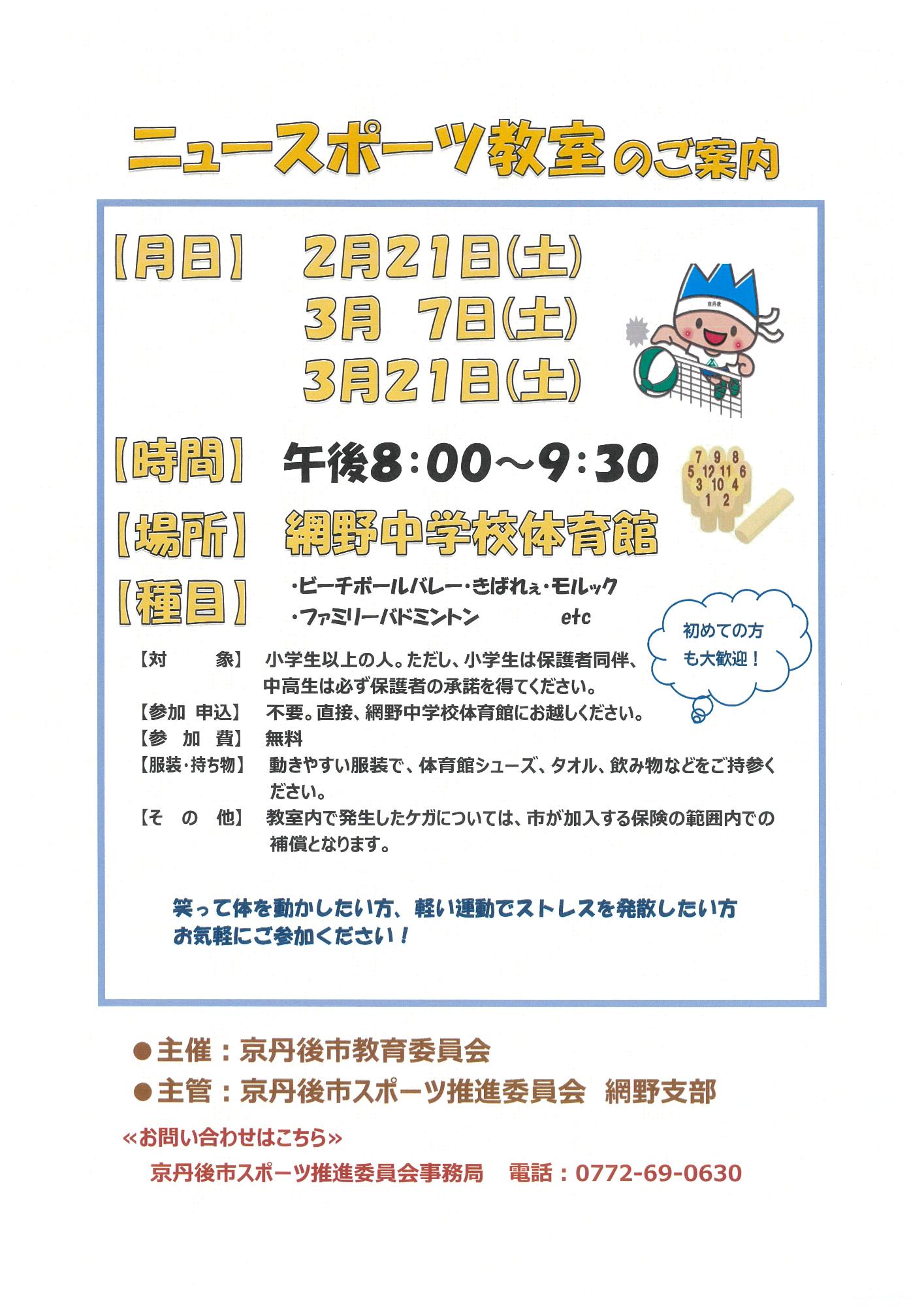 京丹後市では、各町のスポーツ推進委員がニュースポーツ教室を開催し、ニュースポーツの指導にあたっています。