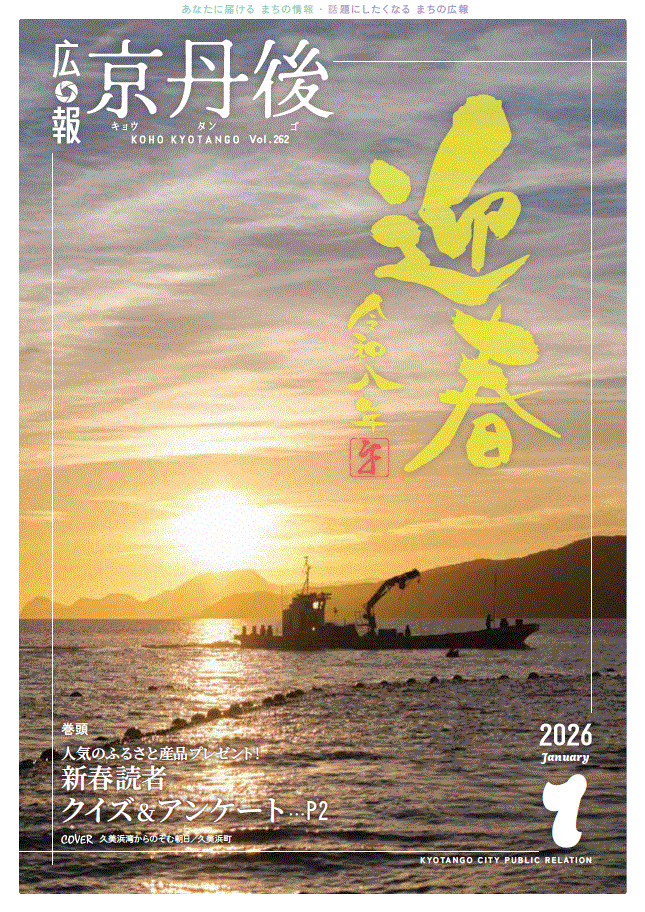 広報京丹後 最新号 広報京丹後 2026年2月号(第263号) バックナンバー 広報京丹後 2026年1月号(第262号) 広報京丹後 2025年12月号(第261号) 広報京丹後 2025年11月号(第260号) 広報京丹後 2025年10月号(第259号) 広報京丹後 2025年9月号(第258号) 広報京丹後 2025年8月号(第257号) 広報京丹後 2025年7月号(第256号) 広報京丹後 2025年6月号(第255号) 広報京丹後 2025年5月号(第254号) 広報京丹後バックナンバー(令和6年度) 広報京丹後バックナンバー(令和5年度) 広報京丹後バックナンバー(令和4年度) 広報京丹後バックナンバー(令和3年度) 広報京丹後バックナンバー(令和2年度) 広報京丹後バックナンバー(令和元年度(平成31年度)) 広報京丹後バックナンバー(平成30年度) 広報京丹後バックナンバー(平成29年度以前) 「広報京丹後」英語版(English translation)