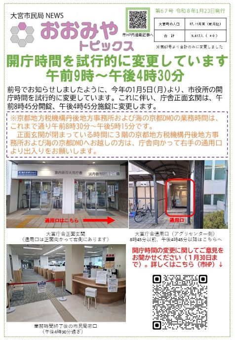 大宮市民局では、大宮町内の地域情報や取り組みをより多くの方に知っていただくため、身近な話題を集めた市民局ニュース「おおみやトピックス」を発行しています。