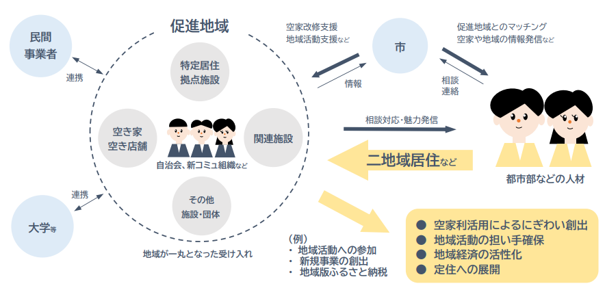 こうした状況を好機と捉え、市では、多彩な人材の誘致による空き家のさらなる利活用、地域の担い手確保や地域経済の活性化に繋げていくため、地域と連携した二地域居住の受け入れや関係人口創出を推進します。
