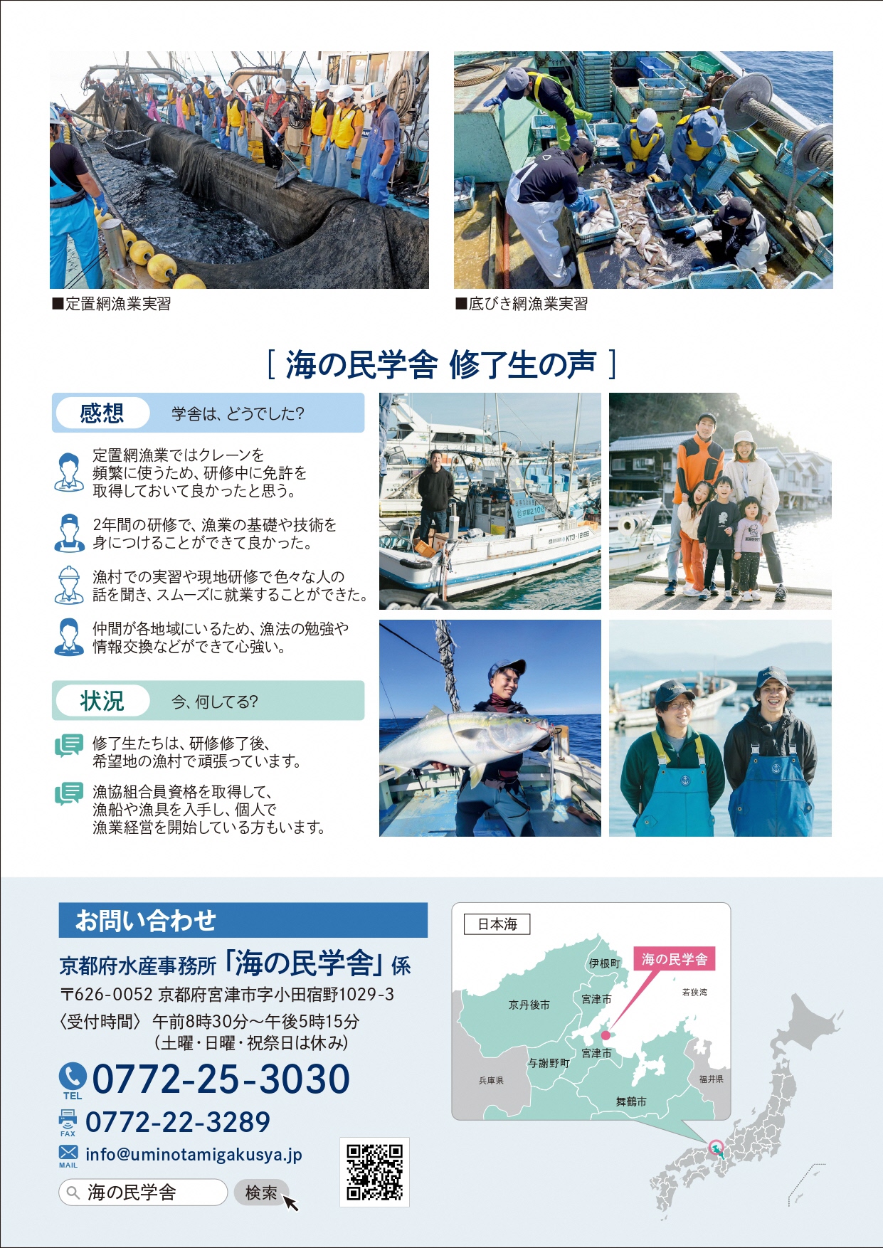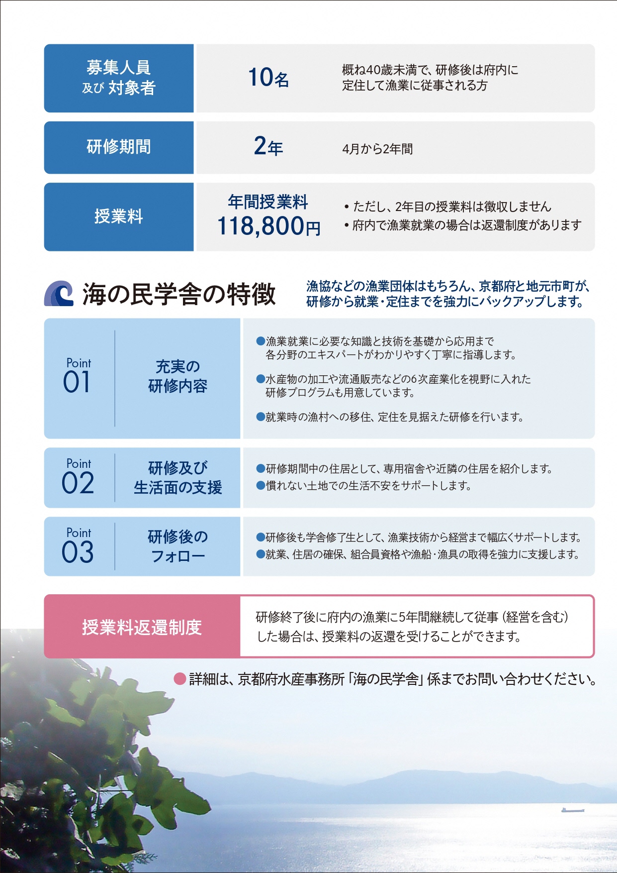 詳しくは、以下チラシもしくは「京都府漁業者育成校 海の民学舎」ホームページをご覧いただくか、京都府水産事務所「海の民学舎」係まで(電話番号:0772ー25-3030)