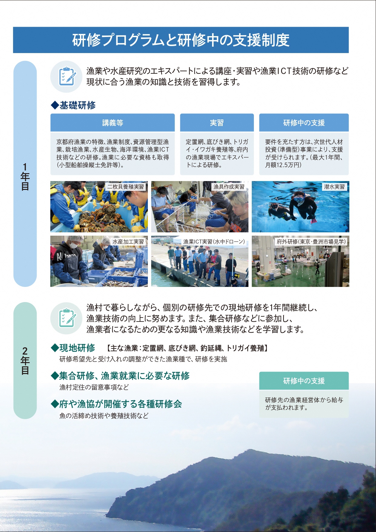 〇募集人数及び対象者 :10名(概ね40歳未満で、研修後は府内に定住して漁業に従事されるかた)